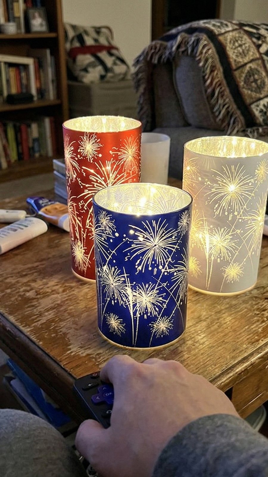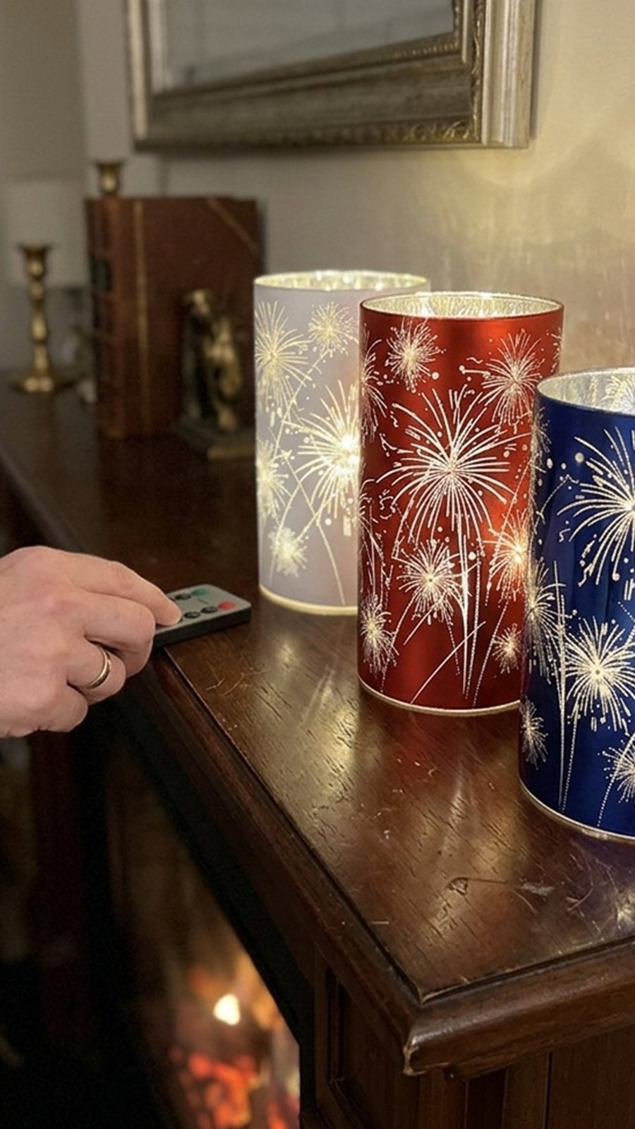What's Included: Set of 3 glass firework lanterns (1 Red, 1 White, 1 Blue) + Pre-installed inner LED lights.